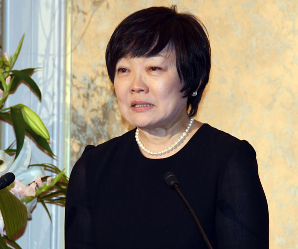 安倍晋三元総理の志を継承する集いで泣きながら挨拶する安倍昭恵夫人(C)日刊ゲンダイ