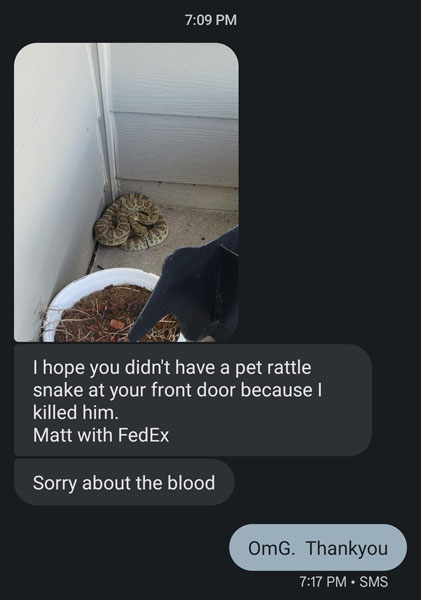 米FedExドライバーが受取人不在先で毒蛇に遭遇! シャベルで駆除し感謝される