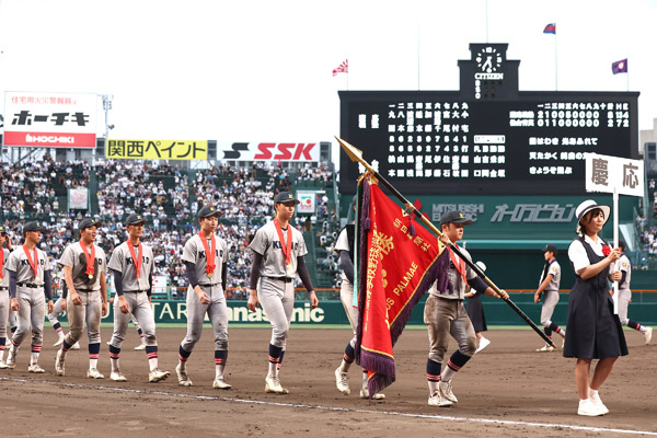 優勝旗を持ち行進する、大村昊澄主将(C)日刊ゲンダイ