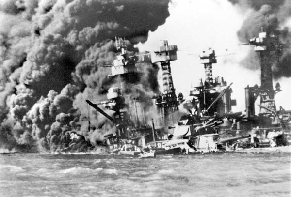 1941年12月8日、日本海軍航空隊による真珠湾攻撃で炎上する米軍戦艦「カリフォルニア」/(ホノルル・アリゾナ記念館蔵)