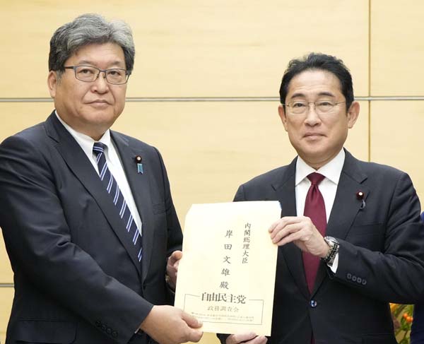 自民党の萩生田政調会長(左)から提言を受け取る岸田首相(C)共同通信社
