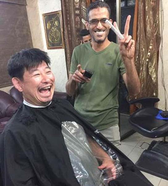 郊外の散髪店で髪を切る小田切拓氏。日本人は初めてと店主は大興奮(2019年西岸)/(写真提供)小田切拓