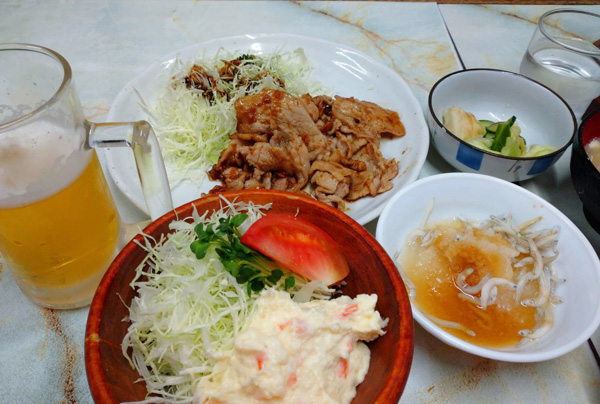 「お食事まるやま」で生姜焼きと中生(C)日刊ゲンダイ