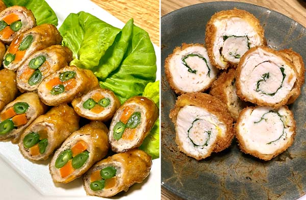 「豚肉の野菜巻き」と「ササミのシソ巻き」(提供写真)