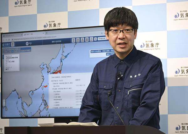 フィリピンの地震による津波について記者会見する気象庁の担当者(C)共同通信社