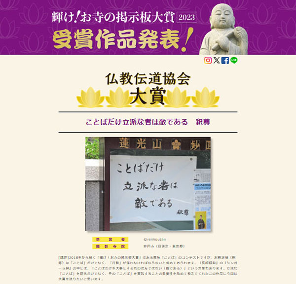 「お寺の掲示板」2023年の大賞は妙円寺 「ことばだけ立派な者は敵である」に込められた意味