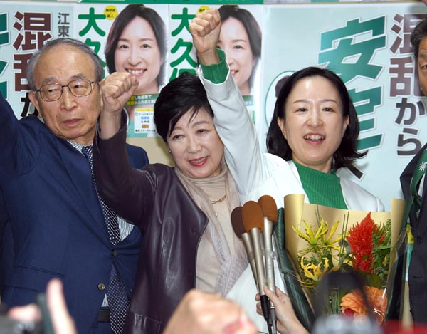 区長選にかかった約2億円の経費は江東区民の税金で(初当選の大久保朋果氏<右>と小池百合子都知事<中央>)/(C)日刊ゲンダイ