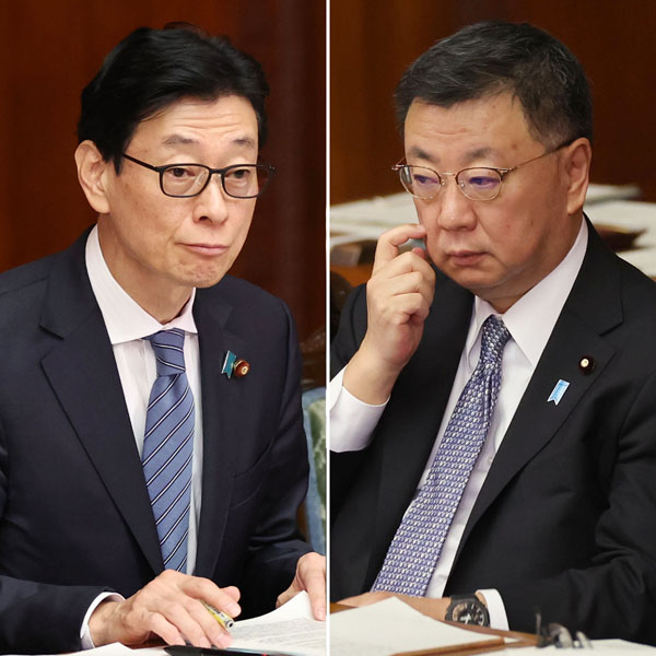 2人とも元安倍派事務総長(西村康稔前経産相と松野博一前官房長官=右)/(C)日刊ゲンダイ