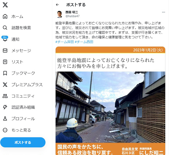 岸田首相側近の西田昭二議員「自らの命の確保と健康に努めて」地元・能登半島地震SNS投稿に反発広がる