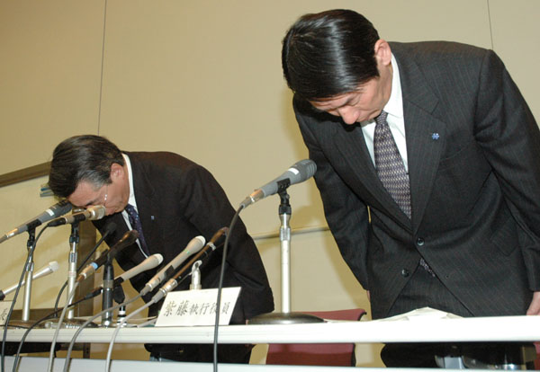 1999年、定期点検中に臨界に達し志賀原発1号機が緊急停止、臨界事故の事実を組織的に伏せた(未報告を謝罪する北陸電力の松波孝之副社長(左)と紫藤正一執行役員=当時)/(C)共同通信社