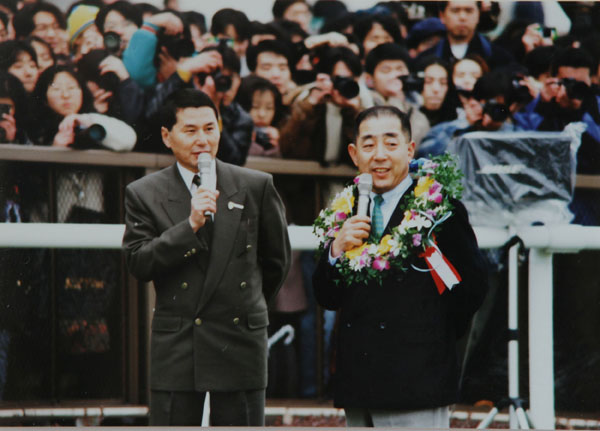平成9年秋の天皇賞でレースを振り返る、元調教師・伊藤雄二氏(右)と(提供写真)