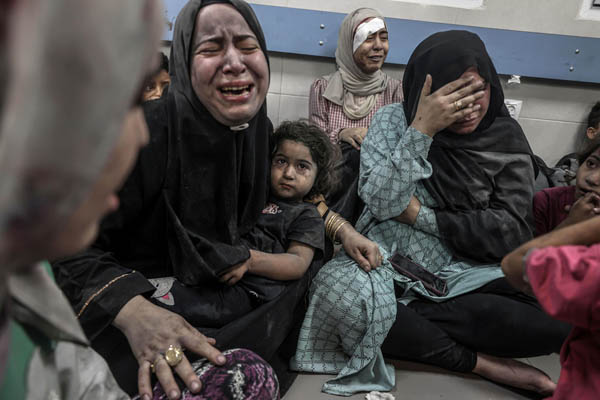 パレスチナ・ガザ地区の病院で泣き叫ぶパレスチナ人女性(C)ゲッティ=共同