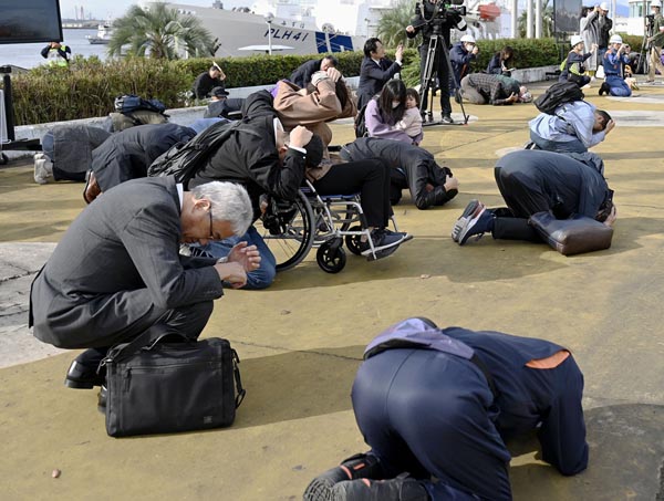 南海トラフ巨大地震を想定し、各地で頻繁に大規模防災訓練が実施されていたが…(愛知県名古屋港での「シェイクアウト訓練」=2023年11月)/(C)共同通信社