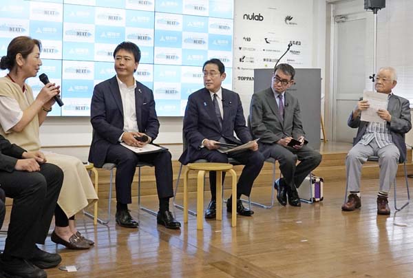 窮地に陥ると車座対話、先頭に立ってやることがコレ?(デジタルトランスフォーメーションに関する車座対話での岸田首相=右3、その右隣りは河野デジタル相、2023年7月)/(C)共同通信社