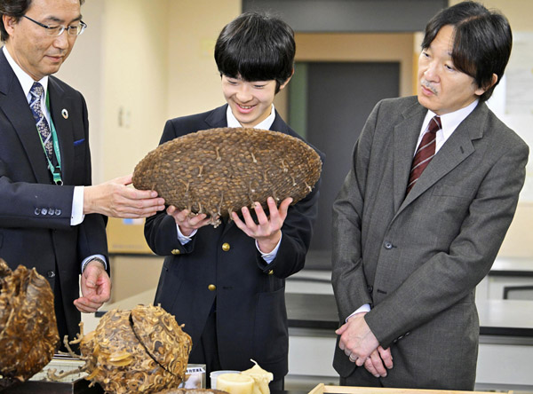 玉川大農学部の昆虫を研究する施設を視察される秋篠宮さまと悠仁さま(代表撮影)