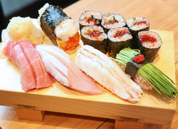 お好み握り(左上から時計回りに、のり玉60円、青唐筋子巻660円、芽ねぎ330円、絶品蒸海老275円、ブリ腹330円、中トロ330円)/(C)日刊ゲンダイ