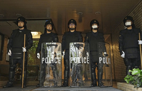 つばさの党の事務所が入る建物の入り口前で警備する機動隊員(C)共同通信社
