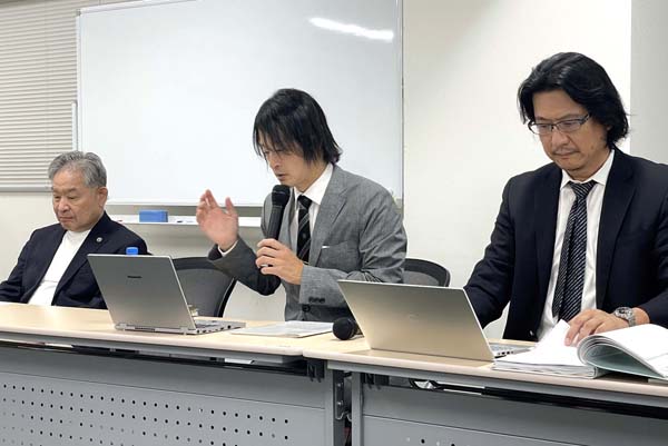 旧統一教会の関連団体「UPF-Japan」による訴訟の口頭弁論後に記者会見する鈴木エイト氏(中央)/(C)日刊ゲンダイ