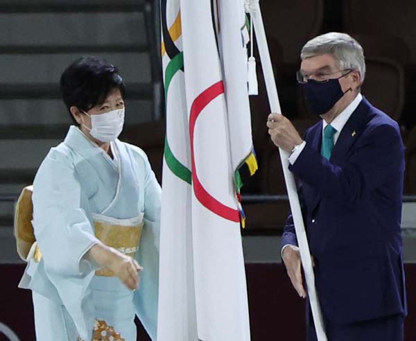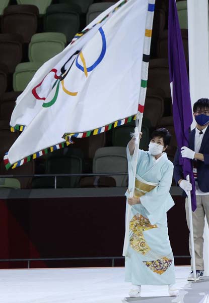 東京五輪閉会式、和服姿で五輪旗を振る小池百合子都知事(C)日刊ゲンダイ