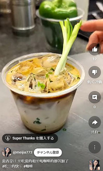 え~っ!ラテに生ネギ入れんのーっ??(中国料理系ユーチューバー「美食家」さんユーチューブから)