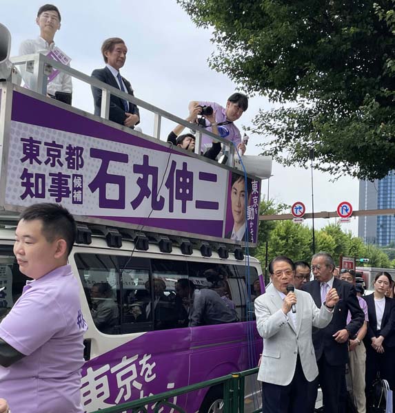 マイクを握るのはドトールコーヒー創業者の鳥羽博道名誉会長(=右側手前、街宣車上左端が石丸伸二氏)/(C)日刊ゲンダイ