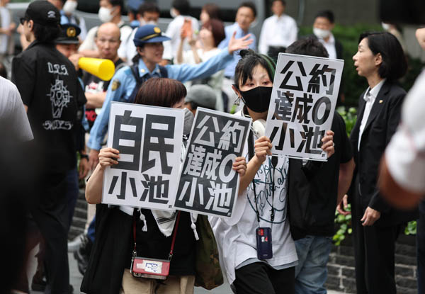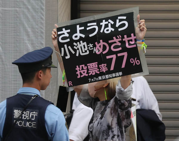 小池百合子都知事が街頭演説をした秋葉原駅前では、こんなプラカードを示す人々も(C)日刊ゲンダイ