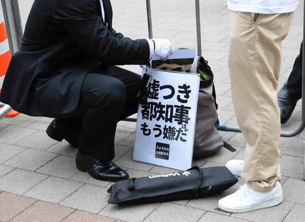 聴衆エリアに入るため手荷物検査を受ける人の中には、プラカードを持参する人も(C)日刊ゲンダイ