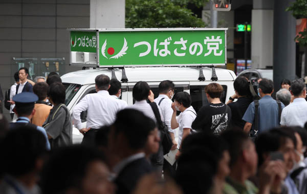 秋葉原駅前へ突入を試みる、つばさの党の選挙カー(C)日刊ゲンダイ