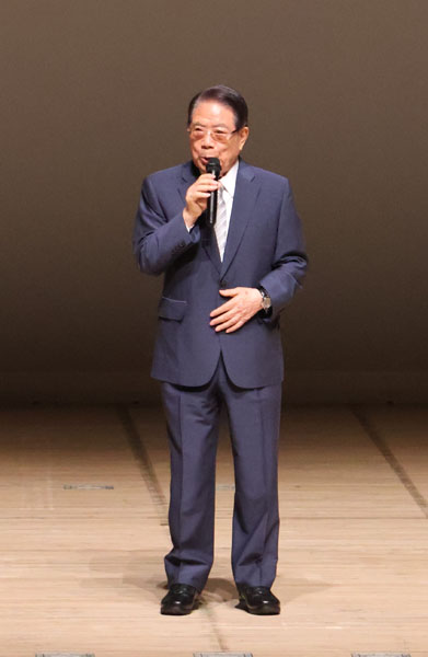 決起集会で挨拶するドトールコーヒー創業者の鳥羽博道名誉会長(C)日刊ゲンダイ