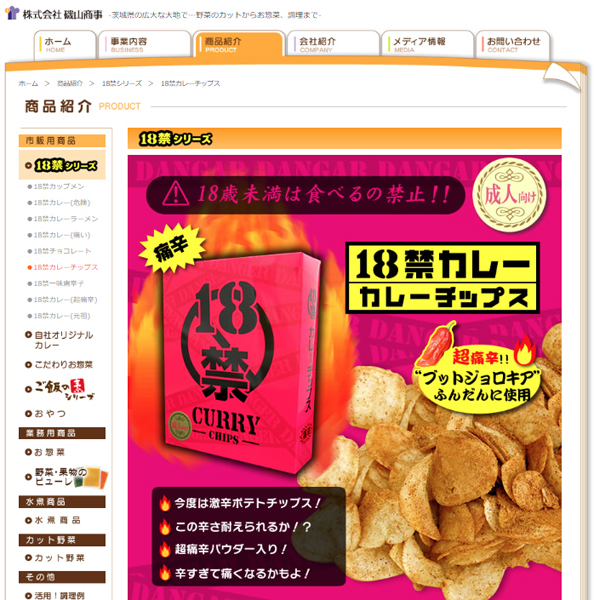 「18禁カレーチップス」の紹介ページ(「株式会社 磯山商事」のHPから)