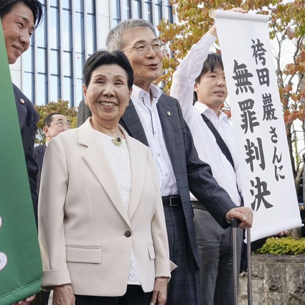 袴田巌さんに無罪を言い渡した静岡地裁の再審判決公判を終え、地裁前で笑顔を見せる姉ひで子さん(中央左)ら(C)共同通信社