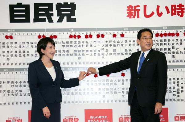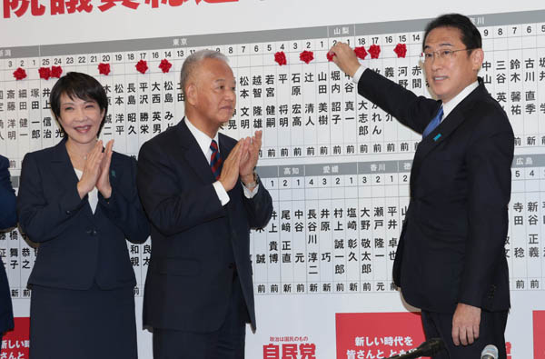 下馬評を翻す勝利だった(2021年衆院選の自民党当選者に花をつける岸田首相、拍手する甘利明氏と高市早苗氏=右)/(C)日刊ゲンダイ
