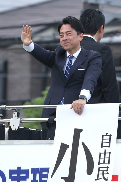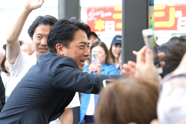 有権者に手を振る笑顔の小泉進次郎選対委員長(C)日刊ゲンダイ