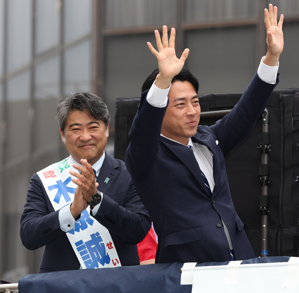 東京20区・木原誠二氏(左、当選)の応援演説で聴衆に手を振る小泉進次郎選対委員長(C)日刊ゲンダイ