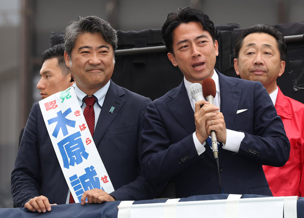 東京20区・木原誠二氏(左、当選)の応援演説をする小泉進次郎選対委員長(C)日刊ゲンダイ