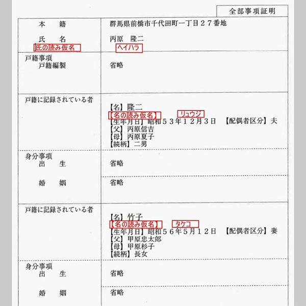 先日、読み仮名記載になったが…(氏名の読み仮名を記載した戸籍のイメージ=法制審議会の資料から)