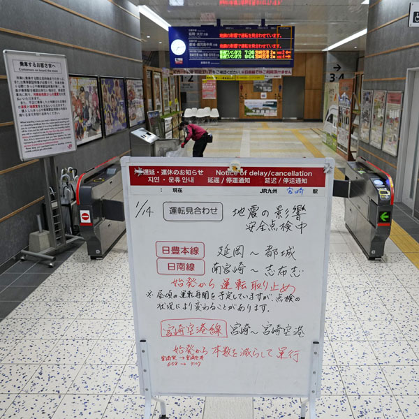 地震の影響での運転見合わせについて知らせるJR宮崎駅の掲示板(C)共同通信社