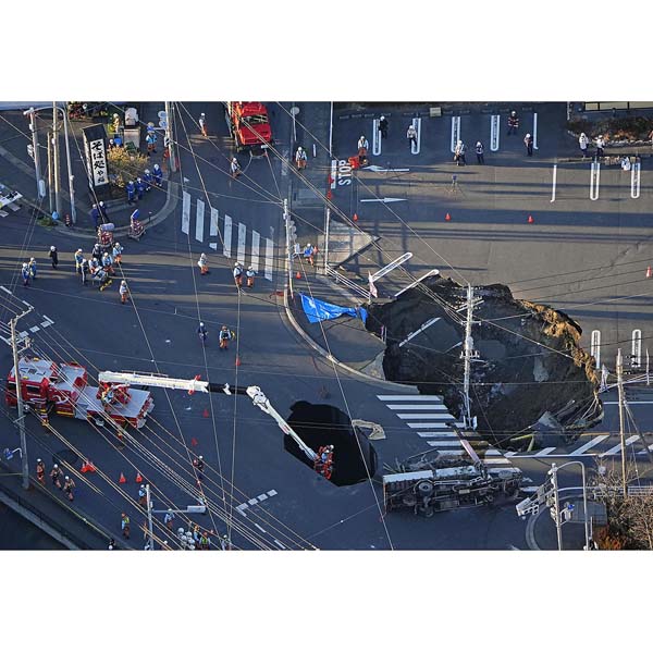 作業中、新たな陥没(右)が発生(C)共同通信社