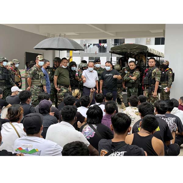 ミャンマー東部の詐欺拠点で救出された外国人ら(奥は、少数民族勢力「国境警備隊(BGF)」の幹部ら=BGF関係者提供、共同)