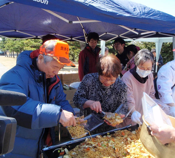 宮城・名取で炊き出しの手伝いをする清水国明(左=提供写真)