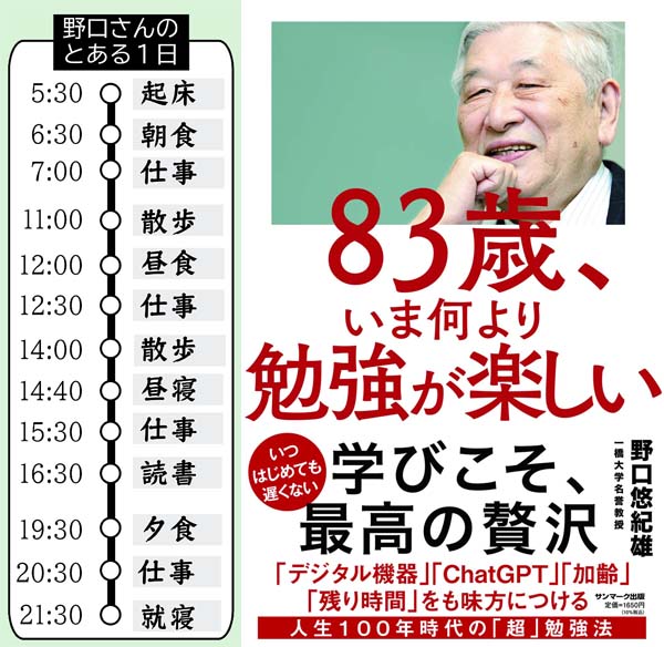 「83歳、いま何より勉強が楽しい」野口悠紀雄著(サンマーク出版)と野口さんのとある1日(C)日刊ゲンダイ