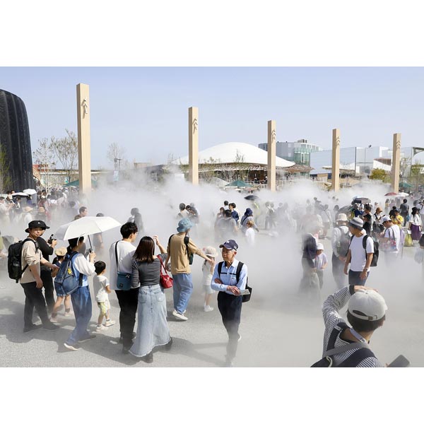 これからが夏本番の暑さ(ミストシャワーを浴びる来場者)/(C)共同通信社