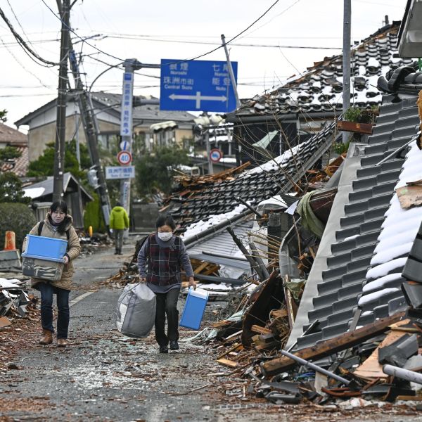 倒壊した自宅から避難所へ布団を運ぶ親子(共同通信社)