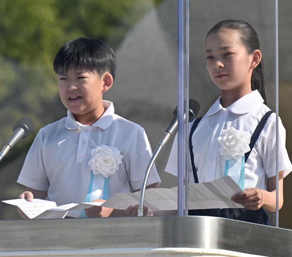 平和記念式典で「平和への誓い」を読み上げる、子ども代表の佐々木駿さん(左)と関口千恵璃さん(C)共同通信社
