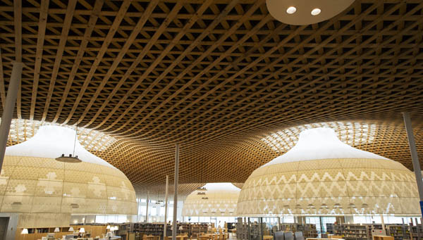 岐阜市立中央図書館(岐阜県)格子天井やグローブが日本家屋のような雰囲気