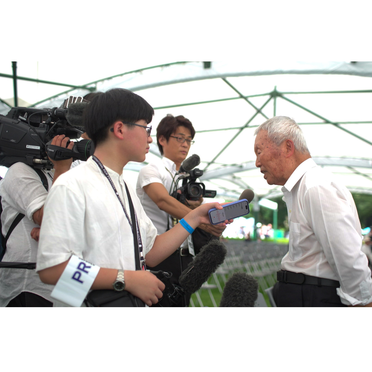 「記者登録」して8月6日の広島原爆忌を取材する日本中学生新聞の中学生記者・川中ダイジさん=左手前(提供写真)