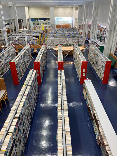 ジャンルごとに色分けされた書架(石狩市民図書館提供)
