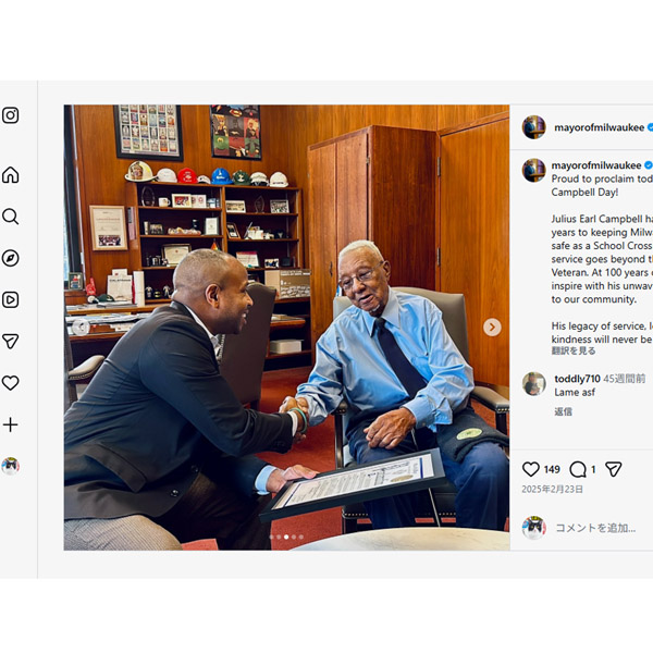 市長と面談し握手するキャンベルさん=右(米ミルウォーキー市長のインスタグラムから)