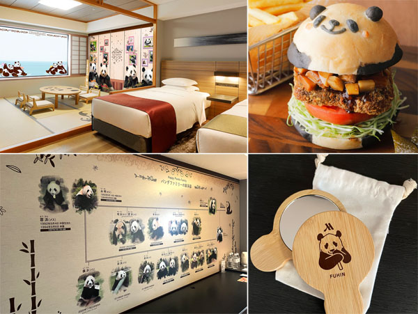 壁や窓にも浜家のパンダたち(左上)、ベッドの向かいは一面家系図(左下)、黒毛和牛ハーブカツとごろごろ筍のパンダバーガー(右上)、竹製オリジナル手鏡(右下)/(C)日刊ゲンダイ