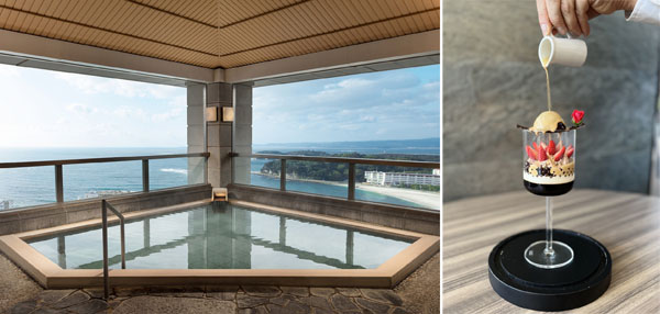 ホテルの温泉大浴場(左)と「まりひめのティラミスパフェ スモークエッセンス」/(C)日刊ゲンダイ